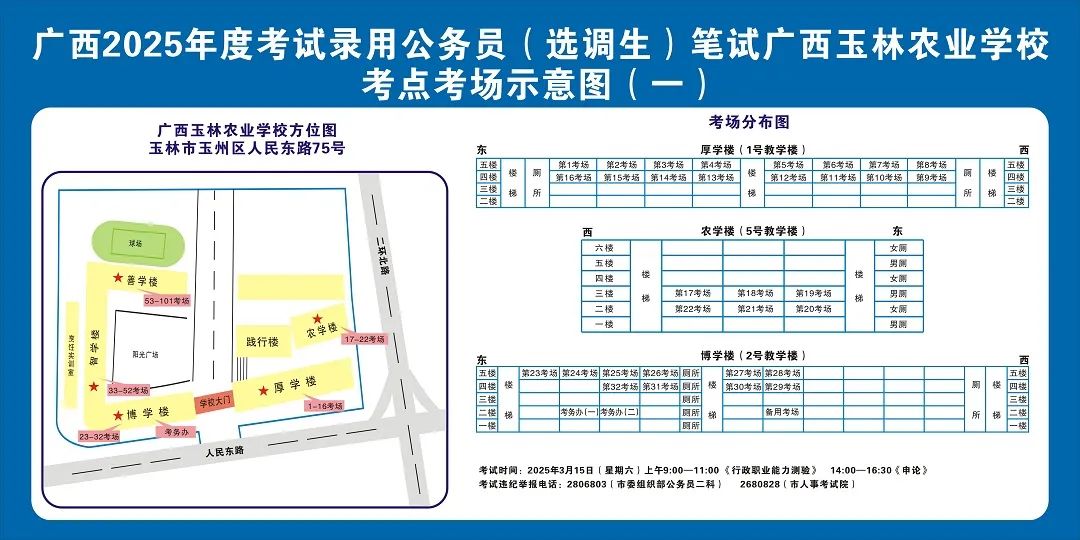 請及時登錄“廣西人事考試網(wǎng)”打印筆試準考證并妥善保管,仔細查看準考證上的考點信息。本次考試玉林市考區(qū)共設11個考點,各考點名稱及地址如下:
