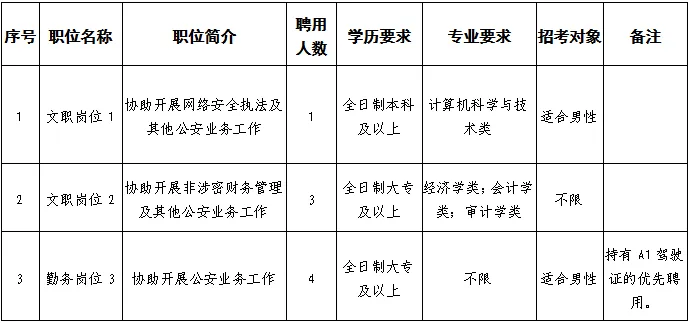 (六)同等條件下,優(yōu)先招聘公安烈士和因公犧牲公安民警、在職公安民警子女、退役士兵、見(jiàn)義勇為積極分子和先進(jìn)個(gè)人、警察類或政法類院校畢業(yè)生、有政法工作經(jīng)驗(yàn)的人員;