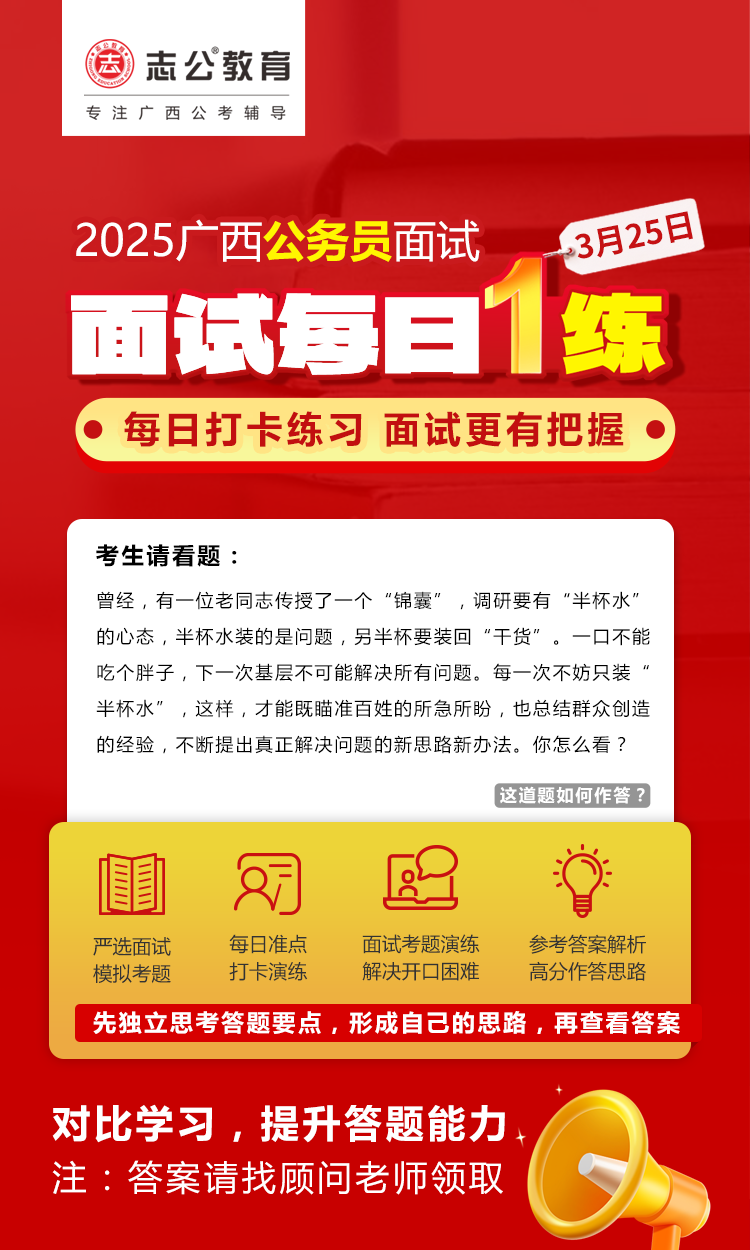 廣西區(qū)考面試準備需緊扣本土特色,強化邏輯表達和實務(wù)能力,同時注重細節(jié)(如資格復(fù)審材料、禮儀)。建議從現(xiàn)在起每天練習2-3套題,持續(xù)積累廣西熱點案例,爭取面試高分!資料已經(jīng)為大家準備好了,快去看看吧!