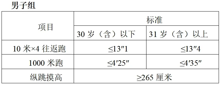 參照《關(guān)于印發(fā)公安機關(guān)錄用人民警察體能測評項目和標準(暫行)的通知》(人社部發(fā)〔2011〕48號)的項目及測試規(guī)則,結(jié)合《公安民警體育鍛煉達標手冊》成績標準,體能測評的項目和標準如下: