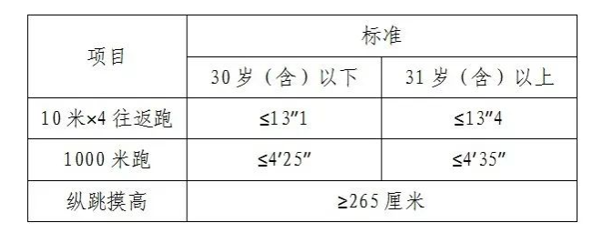 3.體能測評項目和標準按照《公安機關(guān)錄用人民警察體能測評項目和標準(暫行)》執(zhí)行。