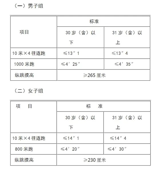 3.體能測評(píng)項(xiàng)目和標(biāo)準(zhǔn):按照《公安機(jī)關(guān)錄用人民警察體能測評(píng)項(xiàng)目和標(biāo)準(zhǔn)(暫行)》執(zhí)行。