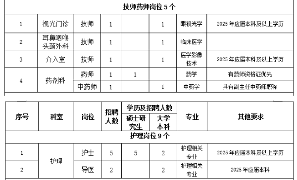 1.18周歲以上,35周歲以下,碩士研究生原則上不超過(guò)40周歲。2.副高職稱人才原則上不超過(guò)45周歲。3.博士研究生、正高職稱人才原則上不超過(guò)50周歲。4.急需緊缺專業(yè)及骨干人才年齡可適當(dāng)放寬。5.學(xué)歷、專業(yè)要求符合《廣西壯族自治區(qū)桂東人民醫(yī)院2025年人才需求表》中的學(xué)歷、專業(yè)和其他要求的條件(詳見(jiàn)附件)。