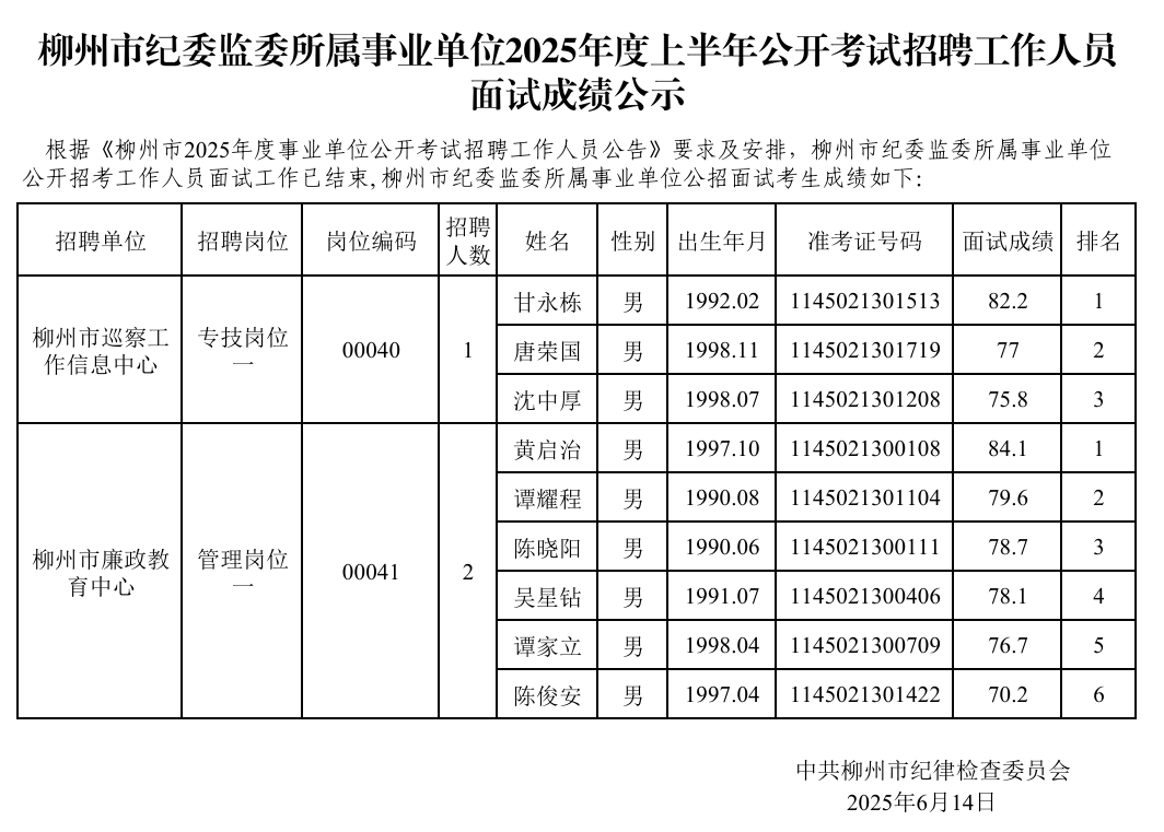 柳州市紀(jì)委監(jiān)委所屬事業(yè)單位2025年度上半年公開考試招聘工作人員面試成績(jī)公示