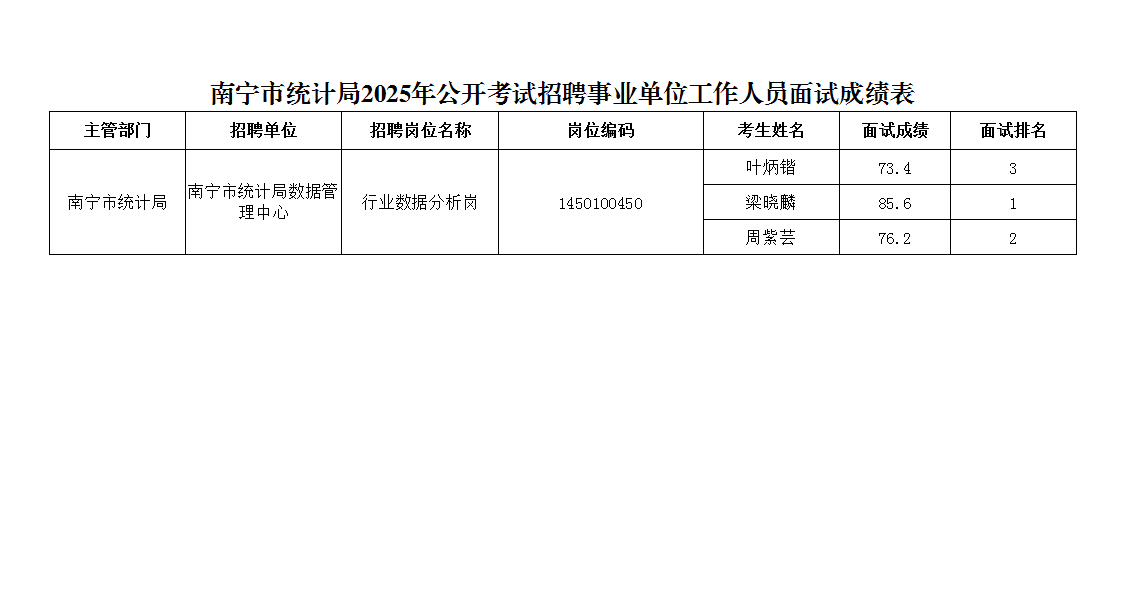 南寧市統(tǒng)計局2025年公開考試招聘事業(yè)單位工作人員面試成績表