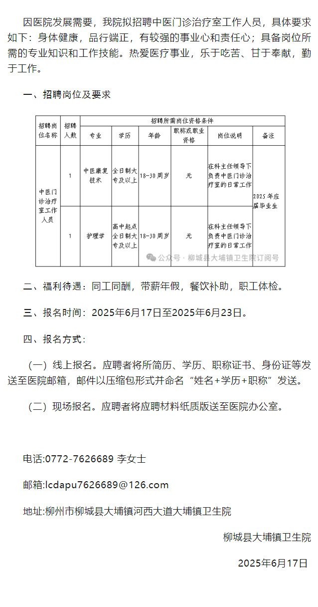 柳城縣大埔鎮(zhèn)衛(wèi)生院中醫(yī)門(mén)診治療室工作人員招聘2人