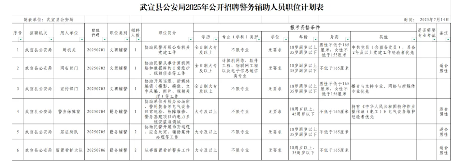招聘人數(shù):8人,詳見《武宣縣公安局2025年第二次面向社會(huì)招聘輔警職位計(jì)劃表》(附件1)。