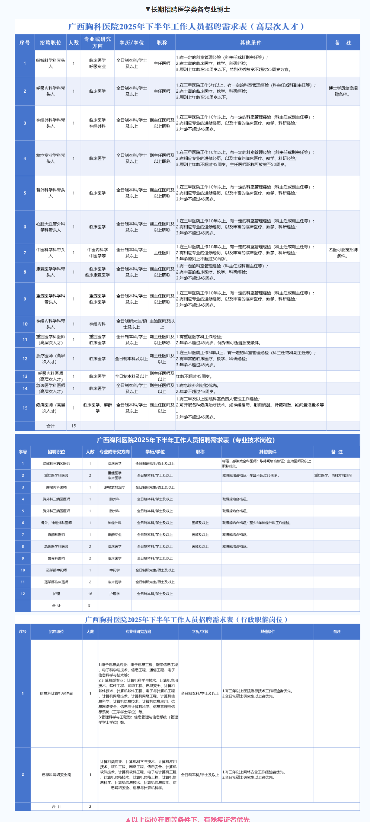 2.網上報名:請將招聘報名表及個人信息匯總表(詳見附件)、個人簡歷、身份證、學歷學位證、大學英語四六級考試成績報告單、在校期間成績單、資格證、執(zhí)業(yè)證、住院醫(yī)師規(guī)范化培訓合格證、獲獎證書電子版打包發(fā)送到廣西壯族自治區(qū)胸科醫(yī)院人事科郵箱gxltyyrsk@126.com。郵件統(tǒng)一命名格式為“崗位+學歷+姓名”,例如:“呼吸內科醫(yī)師+全日制本科+姓名”。