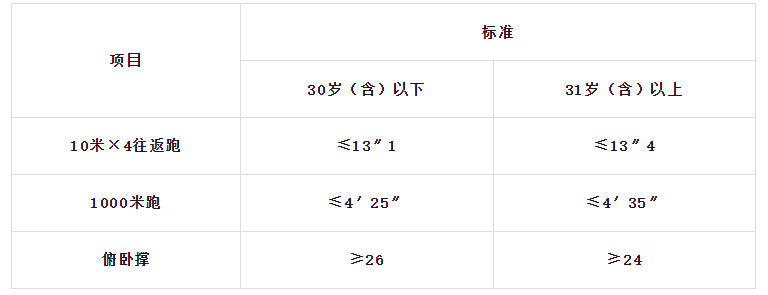體能測試項(xiàng)目三項(xiàng)達(dá)標(biāo)的,視為合格。10米×4往返跑項(xiàng)目的測評次數(shù)不超過2次,1000米跑、俯臥撐等項(xiàng)目的測評次數(shù)為1次。