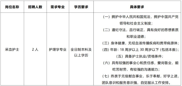 報名所需材料:《河池市中心血站公開招聘報名表》(附件)、個人簡歷、畢業(yè)證書、學位證書、護士執(zhí)業(yè)證/資格證、身份證等,若個人具備特長,需一并附上相關(guān)佐證材料。請攜帶以上材料原件及復印件至指定報名地點。應聘人員應對報名材料的真實性負責,凡弄虛作假的,一經(jīng)查實,即取消報名和聘用資格。