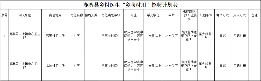 因工作需要,我院擬向社會(huì)公開(kāi)招聘鄉(xiāng)村醫(yī)生2名,現(xiàn)將有關(guān)招聘事項(xiàng)公告如下: