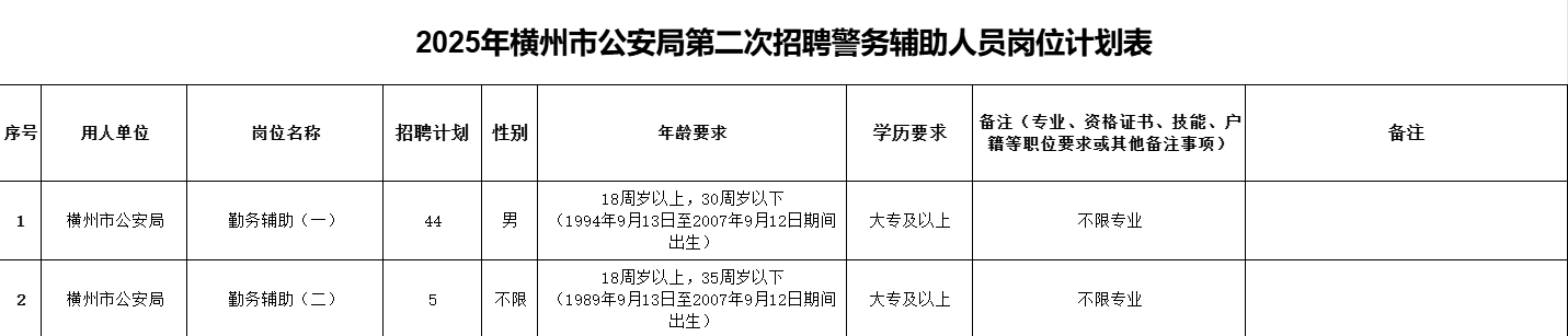 附件1.橫州市公安局2025年度第二次公開(kāi)招聘警務(wù)輔助人員崗位計(jì)劃表