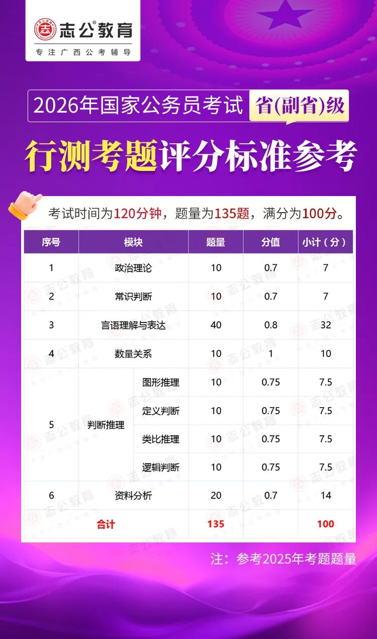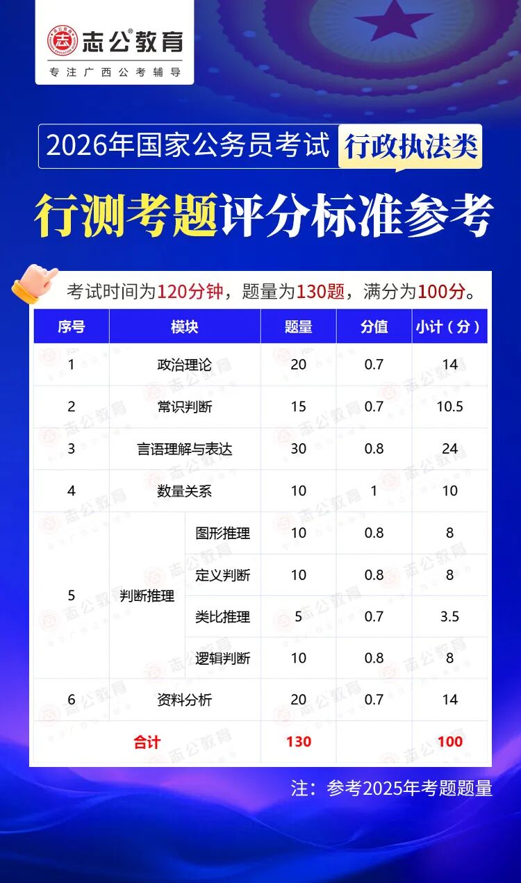 無論報名人數是否會增加,提升自身實力才是應對2026年國考的關鍵。行測作為國考公共科目筆試的核心模塊,不僅分值占比高(通常為 100 分),更是考生之間拉開分差的關鍵戰(zhàn)場。它并非單純考查知識儲備,而是通過言語理解、判斷推理、數量關系、資料分析、常識判斷、政治理論六大板塊,綜合評估考生的信息處理速度、邏輯思維能力、應急決策水平等綜合素質。