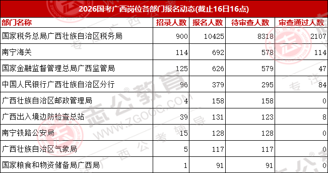 國(guó)考報(bào)名第二天,不少同學(xué)還處在觀望狀態(tài)。目前報(bào)名人數(shù)前三的部門依次為:國(guó)家稅務(wù)總局廣西壯族自治區(qū)稅務(wù)局,報(bào)名人數(shù)10425人;南寧海關(guān),報(bào)名人數(shù)692人;國(guó)家金融管理總局廣西監(jiān)管局,報(bào)名人數(shù)626人;這三個(gè)部門的報(bào)考總?cè)藬?shù)達(dá)11743人,報(bào)考熱度高度集中。