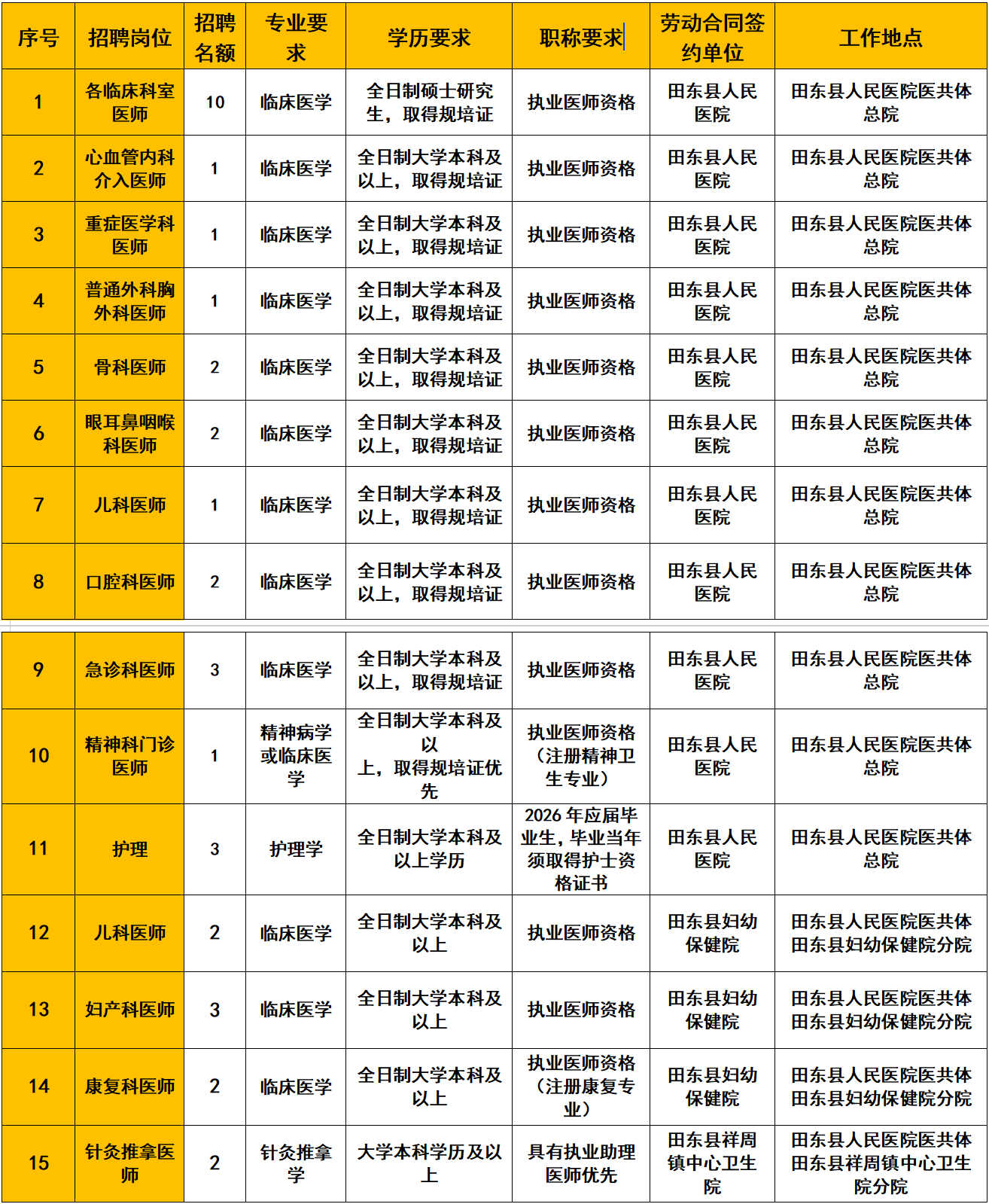 本次招聘是田東縣人民醫(yī)院醫(yī)共體總院根據(jù)總院、各分院的人才需求情況統(tǒng)一招聘,被錄用人員根據(jù)具體工作地點(diǎn)與相應(yīng)分院或總院簽訂勞動(dòng)合同,被錄取人員的薪酬、福利待遇由相應(yīng)的分院或總院按同類型人員發(fā)放。具體招聘崗位詳見(jiàn)附件:《2026年田東縣人民醫(yī)院醫(yī)共體