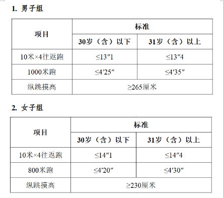 體能測(cè)評(píng)的項(xiàng)目和標(biāo)準(zhǔn)按照國(guó)家有關(guān)規(guī)定執(zhí)行,具體如下: