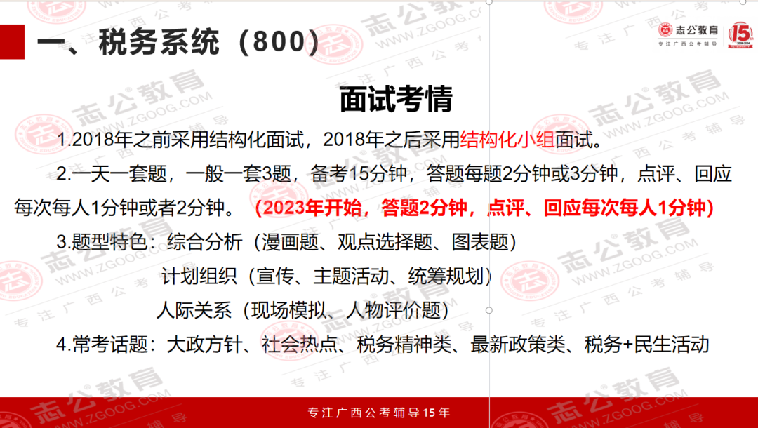 國考面試?yán)?,稅?wù)系統(tǒng)的題目一直有個很明顯的特點,就是緊跟國家政策、貼近實際工作。尤其是2024年廣西稅務(wù)局的面試題,把這個特點體現(xiàn)得特別透徹??催@些題目,既能知道稅務(wù)工作實際需要什么樣的人、做什么樣的事,也能清楚面試到底要考察我們哪些核心能力。今天小志就帶大家了解一下,國考中稅務(wù)系統(tǒng)面試一些相關(guān)信息解讀: