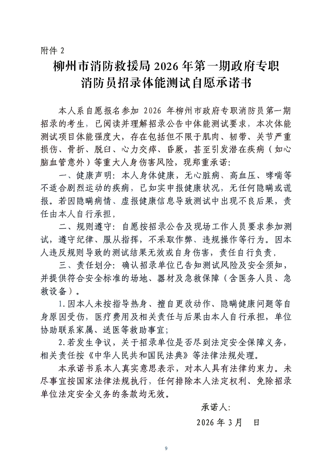 考生在體能測評前需簽署體能柳州市政府專職消防員第一期招錄體能測試承諾書,拒絕簽署的不予進(jìn)行考核詳見(附件2)。