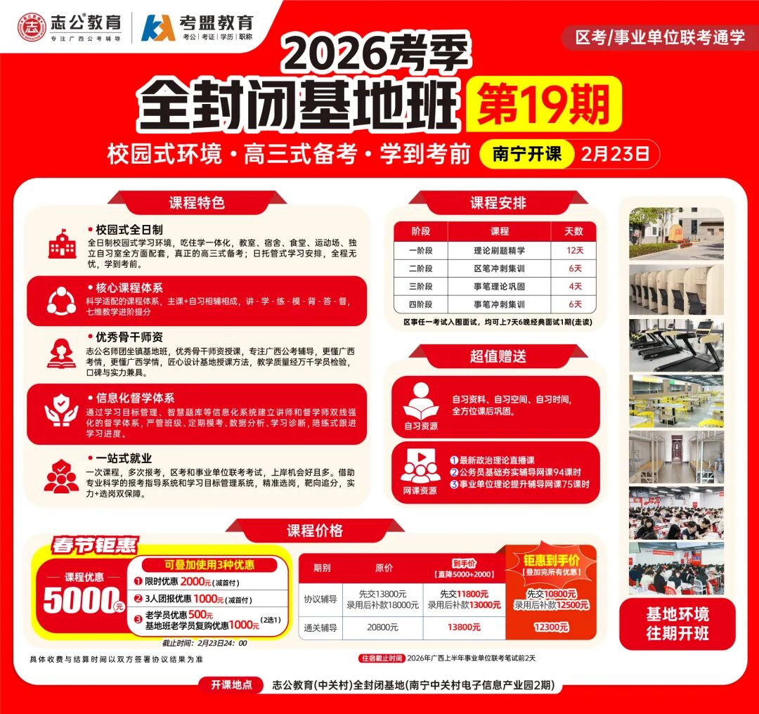 ?校園式環(huán)境,隔絕外界干擾:志公教育(中關(guān)村)2026考季全封閉基地班19期打造全日制校園式學(xué)習(xí)環(huán)境,高三嚴(yán)管式備考,一直可以學(xué)到考前。如果你自律性較差,需要一個(gè)好的學(xué)習(xí)氛圍和環(huán)境;如果你想要更快速上/岸,那你需要一個(gè)科學(xué)的學(xué)習(xí)體系,如果你想要考更好的職位,那你需要個(gè)性化和有效的提分方案,那么恭喜你,已經(jīng)找到了解決方法,請(qǐng)來(lái)志公教育全封閉基地班!