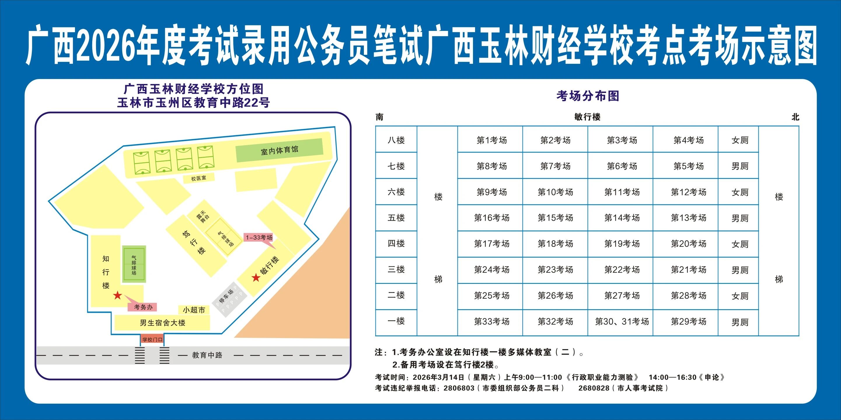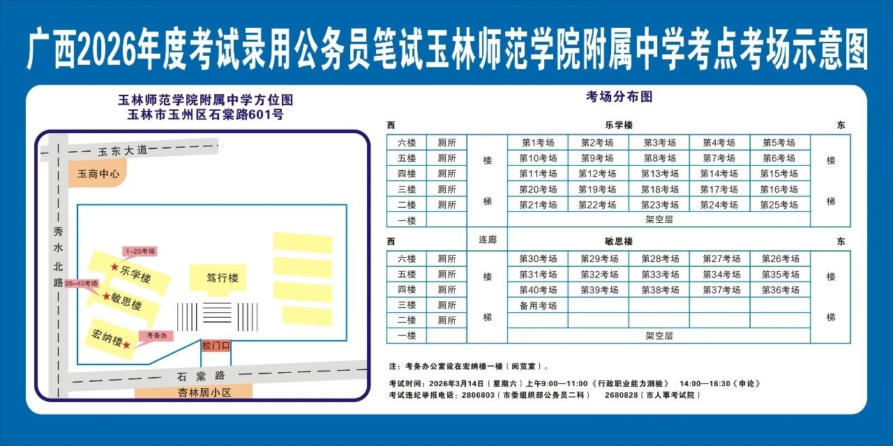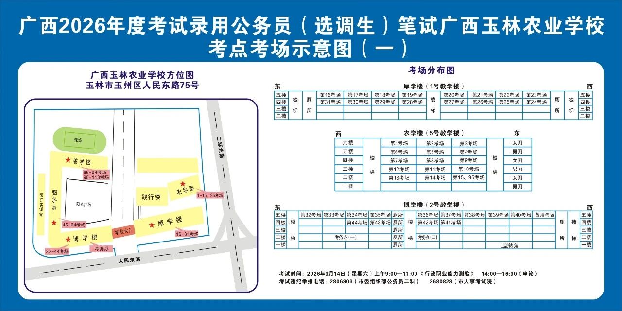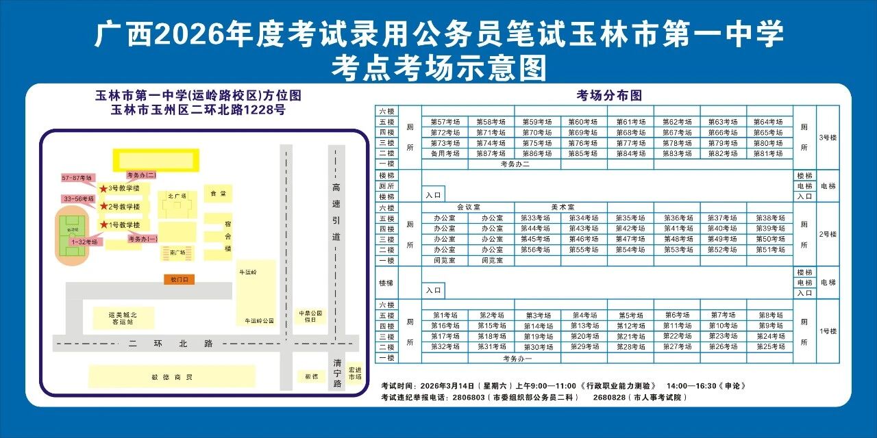 除考試當(dāng)天考生可以進入考點外,考生不得提前進入考點查看考場(學(xué)校將在大門處擺放考場分布示意圖),玉林考區(qū)10個考點的考場布置情況如下: