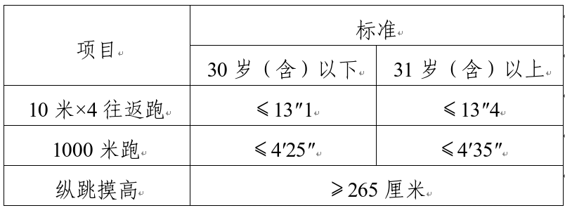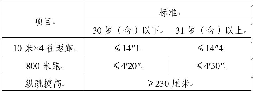 綜合管理類、執(zhí)法勤務(wù)類職位測(cè)查全部三個(gè)項(xiàng)目,三項(xiàng)全部達(dá)標(biāo)方為合格;警務(wù)技術(shù)類職位免予測(cè)查1000米(男)/800米(女)跑項(xiàng)目,其他兩項(xiàng)全部達(dá)標(biāo)方為合格;報(bào)考外語及少數(shù)民族語言翻譯緊缺職位的人員,體能測(cè)評(píng)三項(xiàng)中有兩項(xiàng)達(dá)標(biāo)的,視為合格。