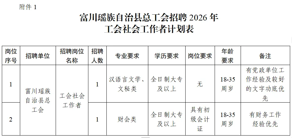 1.富川瑤族自治縣總工會(huì)招聘2026年工會(huì)社會(huì)工作者計(jì)劃表