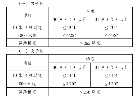 體能測(cè)評(píng)三項(xiàng)全部達(dá)標(biāo)方為合格。其中:縱跳摸高的測(cè)試次數(shù)不超過(guò)3次,10米×4往返跑的測(cè)試次數(shù)不超過(guò)2次,1000米跑/800米跑的測(cè)評(píng)次數(shù)為1次。