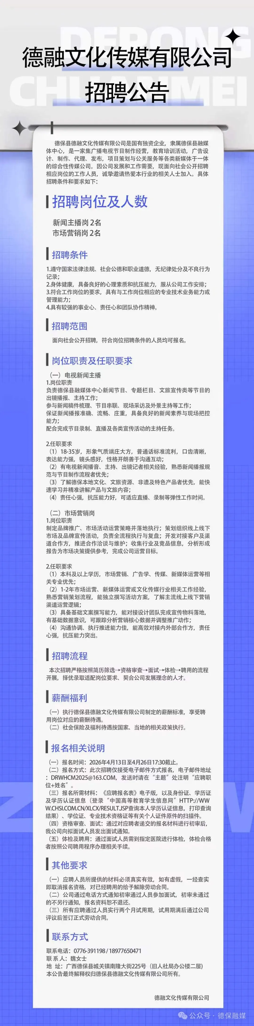 原文標(biāo)題:2026年德融文化傳媒有限公司招聘公告
